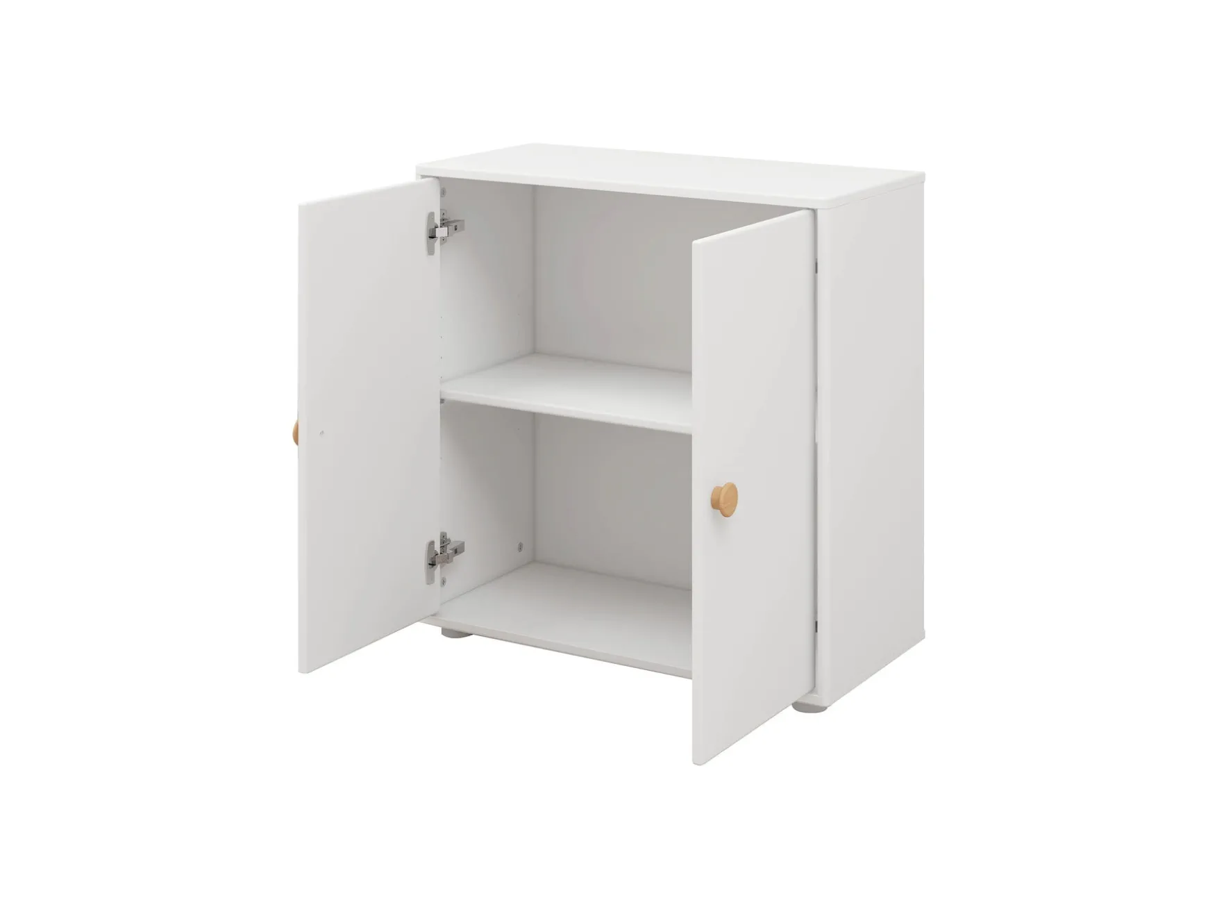 Reolen er i tidløst, skandinavisk design med afrundede kanter og soft-close låger, der sikrer, at små fingre ikke kommer i klemme, når lågerne åbnes og lukkes. Den har runde trægreb, som kan fås i flere forskellige farver, og den er perfekt til opbevaring af bøger, legetøj og spil på børneværelset. Den passer under halvhøje FLEXA-senge, og den kan nemt kombineres med andre opbevaringsmoduler.